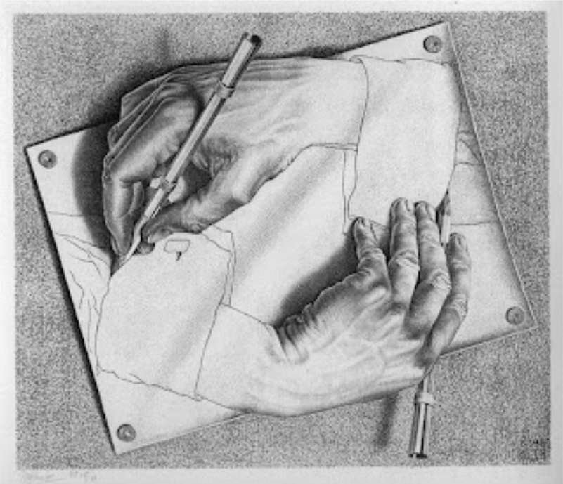 接下来我们将谈谈,一个系统在什么时候能够意识到自我的存在。这与我和我们集智俱乐部长久以来追索的一个大问题密切相关,这个问题也和我们一开始谈到的冯·诺依曼问题存在密切联系,这便是自指。自指早期的讨论来源于《哥德尔、艾舍尔、巴赫——集异璧之大成》这本书,我也强烈推荐大家去阅读它。(解读GEB的视频 https://campus.swarma.org/course/51)