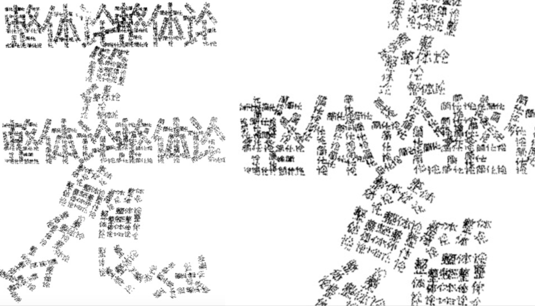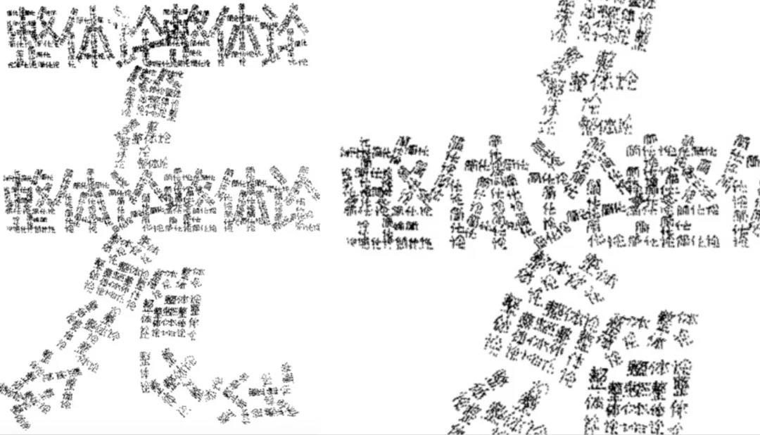 更进一步,如果我们追问,涌现是什么,那么可以这样回答,涌现就是一个系统或者说一组东西,当然,这些东西不一定构成了复杂系统。比如下面这张图,图的左边是整体,右边是放大的细节,可以看到,在宏观上出现了一个“无”字,中观上出现的是“整体论”,而微观上,出现的却是“简化论”。这便是涌现的奥秘,它超出了我们往常认为一个系统只能表达一个意思,事实上,正如这张图所示,我们从不同的尺度去观察,完全有可能得到不同的信息。