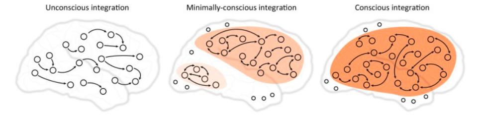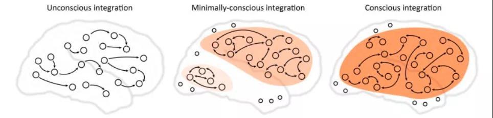 具体来讲,托诺尼定义了一个最大指标,其涉及到如何对系统进行划分,从而找到一个最小的不可再分的集团,当我们找到这一集团后(某种程度上类似于复杂网络中寻找最大连通集团),其任意一部分都与整个系统存在紧密联系,同样,这一紧密联系将通过前面所说的互信息进行刻画。即一个有意识的、意识度很大的体系具有如下特性,其任意一部分都与其他部分存在非常强的因果联系。这样的一个体系便被称为整合信息也即信息量最大的一个体系。