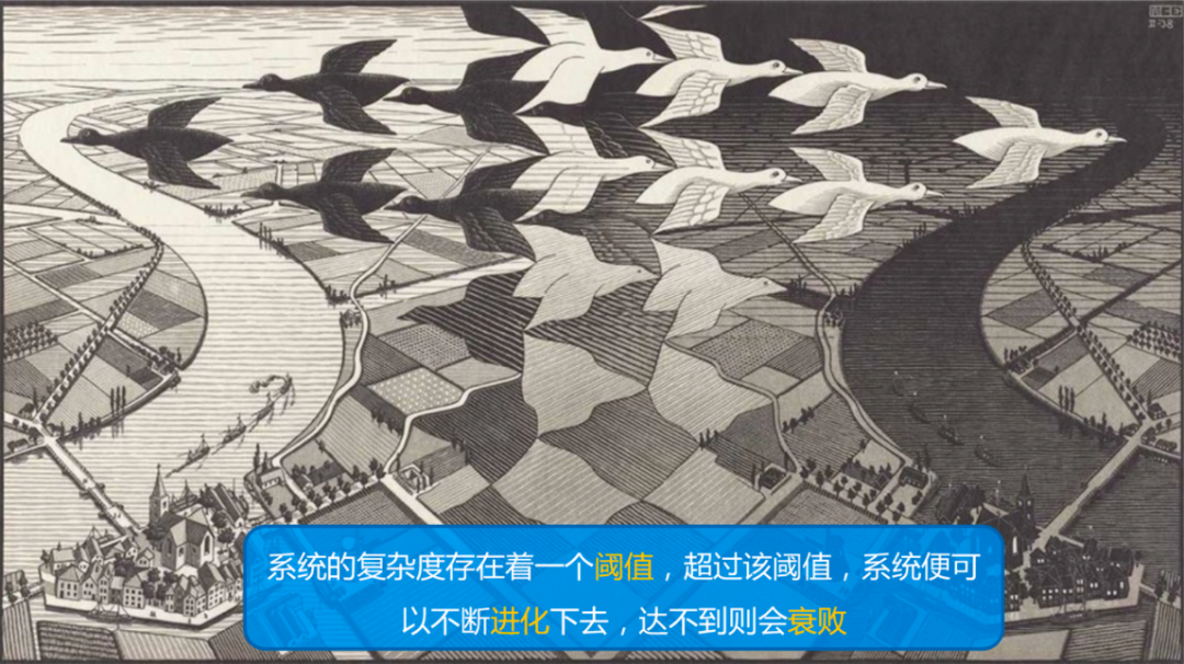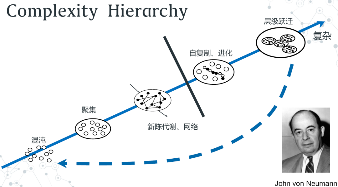 冯·诺依曼提出,所有已知的复杂系统,存在一个明确的分水岭,分水岭的左边,大部分是人造系统,比如当时的计算机、汽车、厂房等等;分水岭的右边,大部分是诸如人的大脑、细胞、生命、生态系统等大自然形成的系统。在分水岭左边的系统,随着时间的变化会不断降级,比如我们需要经常保养汽车,否则就会出各种问题;与此相反,在分水岭右边的系统,不仅不会随着时间的变化而降级,反倒能够不断进化,特别站在生态系统角度看,其中的物种能生生不息,并且似乎变得越来越高级。由此,冯·诺依曼判断,在复杂系统中存在一个复杂度阈值,如果系统的复杂度没有超过阈值,那么系统便会在热力学第二定律的作用下不断降级,以至于最后瓦解,相反,一旦超过这一阈值,系统便仿佛能够超越热力学第二定律,得以不断升级并进化。对此,冯·诺依曼提出问题,复杂系统的阈值究竟是什么?