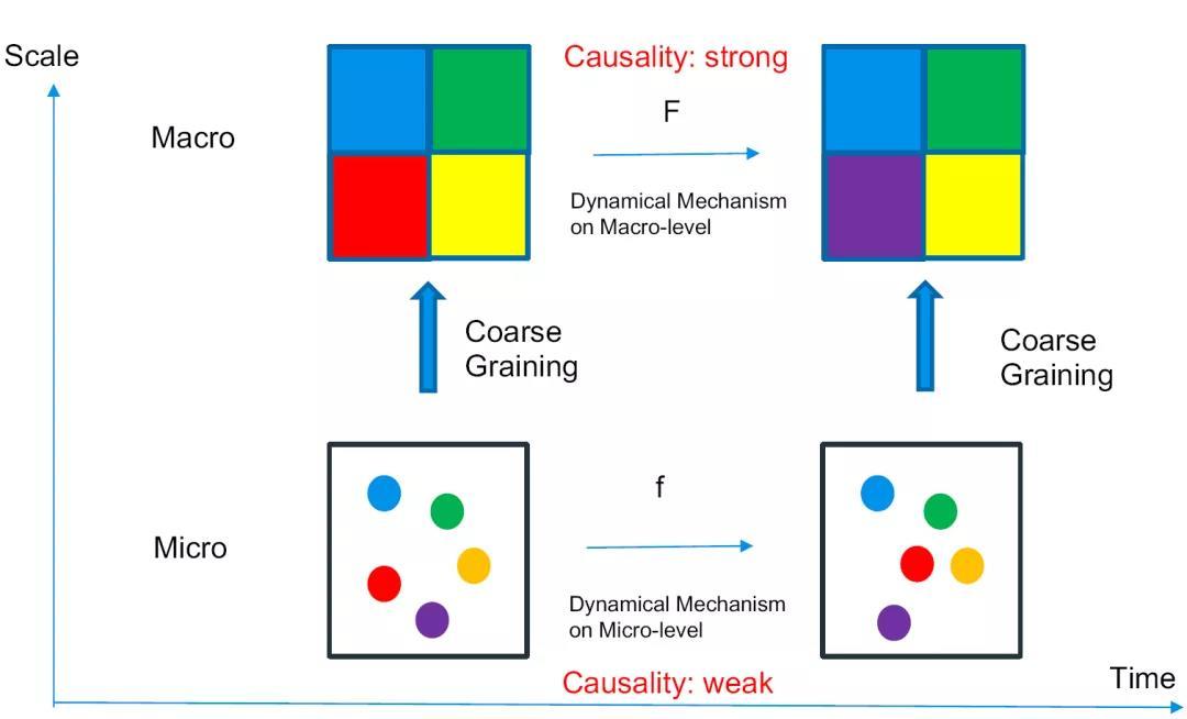 我们先看底下的微观层次,可以认为,微观层次是这个世界的本质,比如现实里空气由一大堆气体分子小球组成,气体分子会遵循气体动力学,我们把它叫做微观因果机制或者微观的动力学机制(f)。但是由于在微观层面上存在着大量的随机性,或者是混沌特性,即混沌系统中尽管顶端力学机制是确定的,但仍然存在很强的不确定性。所以这时候,我们认为,它的因果联系、因果特性非常弱。(这里所指的强弱,在后面将有严格的数学定义,即使用互信息进行定量刻画。)于是,微观上便只能观察到随机的、不确定的机制,因果联系也非常弱。