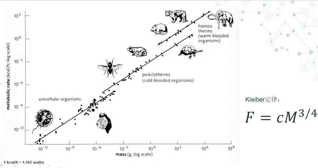 实际上,有很多特性只有通过尺度缩放才能发现。比如克莱伯定律(Kleiber's law):当我们对自然界的生命体进行从小到大的缩放时,可以发现一种新的规律,即生物体的基础代谢率水平与体重的¾次幂成正比。这一规律横跨了数十个数量级,无论是单细胞生物、冷血动物还是哺乳动物,都遵循同样的法则。