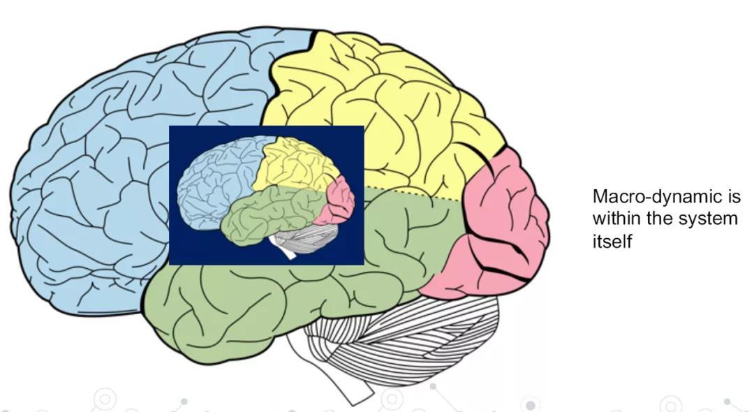真正的大脑便解决了这一问题。大脑的粗粒化机制并不需要外界的加入,其就存在于大脑本身。这意味着我们的自我意识一定存在于大脑的特定区域而不是大脑外,这正是我们自我就足以想象“我”能够走出房间,可以做各种动作,对未来进行一系列想象。而这些复杂的思考都内嵌于大脑内部,这也正是我们的动力学系统所差的一点。