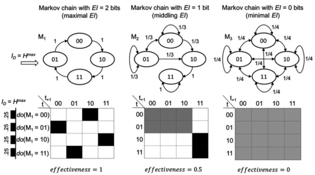 三个不同的系统产生三个不同的马尔科夫链。(左)具有确定性动力学的系统 EI=2 bits,互信息最大;(中) 部分确定、部分随机的系统 EI=1 bit;(右)完全随机动力学的系统 EI=0 bits,互信息最小。
