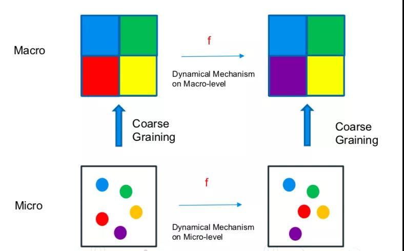 进一步地,我们假设,每一个时间步都可以做粗粒化操作,而下一个t+1时刻,也可以得到一个粗粒化的宏观态。那么,我们便可以在宏观尺度上,看两个时刻的变化,而这一对应机制,便是宏观态下的动力学机制(F)。