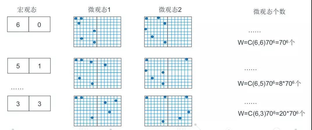 粗粒化的历史可以追溯到统计力学之父——玻尔兹曼(Boltzmann)身上。在他的墓碑上,刻着统计力学的核心概念:S=k㏑Ω(玻尔兹曼熵),而熵的定义,便与粗粒化有着紧密联系。我们可以从下图进行理解:当我们从宏观态描述时,每个小球可以划分到左边、右边,那么,宏观态的描述便是最左边一列,中间是小球的微观态,不仅有左右大区域,还有很多格点。比如第一种宏观态对应非常多种微观态,大约是706个。我们对其取自然对数,便是玻尔兹曼熵。实际上,玻尔兹曼熵便是我们进行粗粒化操作后所忽略的信息量。而把熵的概念引入后,统计物理这一学科便得以建立,宏观热力学特性便可以从微观角度进行解读。