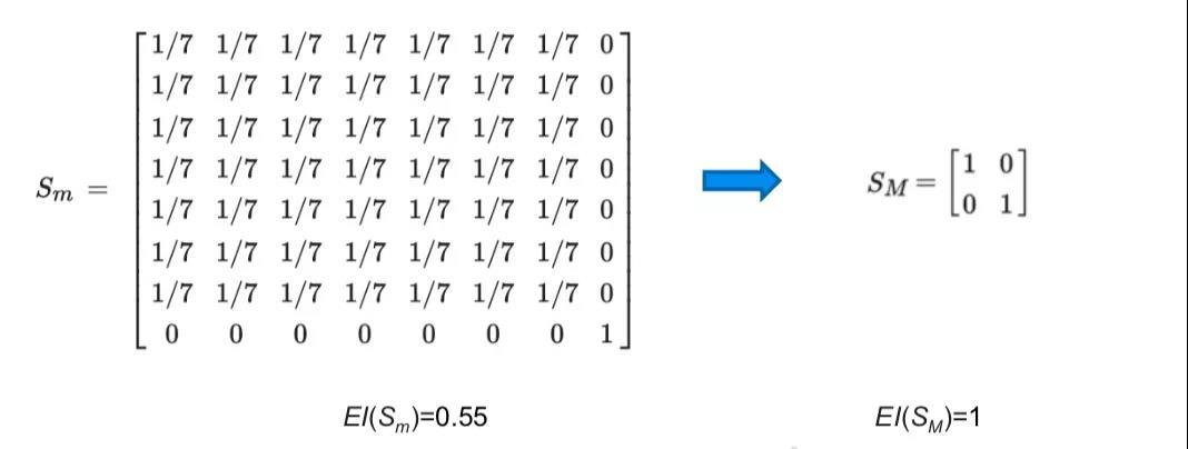 而对于这一动力学,我们可以进行粗粒化操作,即把前7个微观状态映射为一个宏观状态,我们将这一宏观状态称作随机态,第8个状态映射为另一个宏观状态,将其称为确定态。此时,宏观状态的描述只有两个,一个是随机态,一个是确定态。此时,动力学也自然确定了,即都是由“自己到自己”的变化,而其互信息也得到最大化。