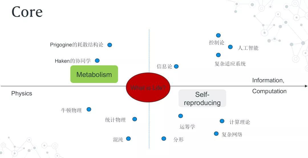 不过,从我个人的理解,复杂性科学确实存在一个核心问题 。事实上,在谈到复杂性时,我们更加关注一个活的、有生命的系统,那么,什么是生命便成为复杂性科学的核心问题。对于这一问题,很多人第一反应或许是,这不是生物学应该研究的内容吗。但从系统科学层面讨论,我们需要的是从具体的生物体提炼出来的抽象模式,也即生命的“软件”。当然,很多知识仍旧需要我们回到生物的物质基础,但我们的核心目的,仍旧是从其中提炼出一组能够泛化到各个生命之中的特性。针对这一问题,我画了一张图,随机选了一些理论放在上面,坐标左边是物理,右边是信息与计算,而生命恰好就在这条轴的中间。这张图告诉我们,生命的奥秘实际上是物理和信息的交汇。