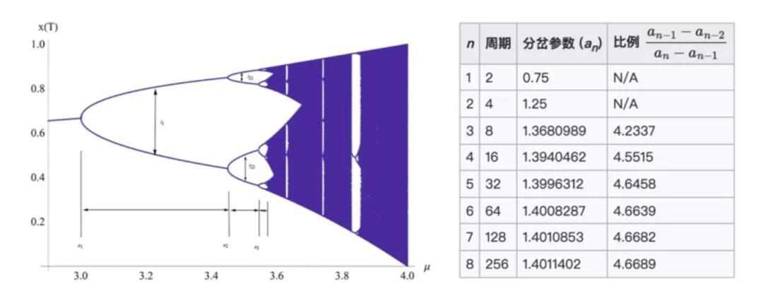 这一动力学具备分形的特性,当我们将动力学的吸引子画成随 λ(在下图是μ)而变化的相图,可以发现它具备分形的结构,根据这一结构可以计算出费根鲍姆常数,即两个分叉彼此之间的宽度两两作差后取比值,当n趋近于无穷大时,其会趋近于一个常数。而费根鲍姆常数是可以通过理论推导出来的,具体过程就是通过重整化操作,即粗粒化后比较宏观尺度与微观尺度两套映射法则之间相似的地方,由此可以建立系数的联系,于是,便可以计算出费根鲍姆常数。