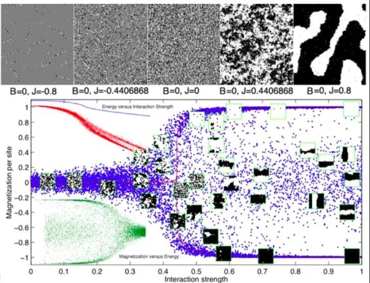 第三个例子就是伊辛动力学。伊辛模型研究的是一堆小磁针在温度达到临界水平的相变。此时,有各种各样的标度指数在其中出现,比如计算特定图形的分形维度,也可以计算两个小磁针之间的相关系数,相关系数会按指数、幂律的形式分布。整个体系的行为充满了各种各样的自相似特性。但是问题的关键在于,如何求解这些幂律指数,如何从理论的角度进行推导,同时如何推导临界相变的温度。