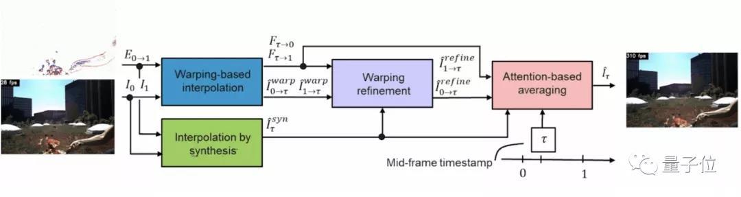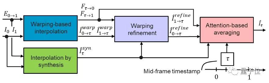 首先,将俩相机拍到的帧信息和事件信息发送到前两个模块:基于变形(warp)的插值模块和合成插值模块。